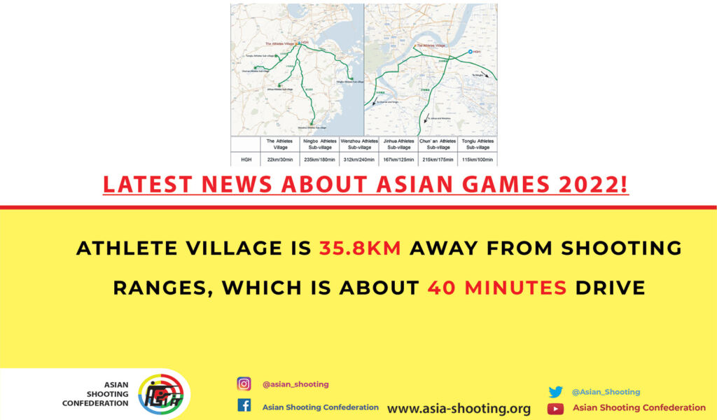As part of ASC follow up with Asian Games 2022 Organizing committee, we have come to know that the competition venues has come to an end and the venue operation design has been completed. The ASC was keen to ensure that shooting ranges are not very far away from the Athletes Village. Fortunately, the shooting ranges are 35.8 KM away from shooting ranges, which is about 40 minutes drive.