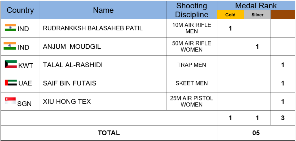 The competition was held with the participation of ISSF member federations. The Asians atheletes were also among the talent and made outstanding achievements. The Asian federations achieved a total of 5 medals, which were India a total of 2 Medals (1 Gold and 1 Silver), Kuwait (1 Bronze), UAE (1 Bronze), and Singapore (1 Bronze).