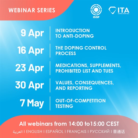 International Shooting Sport federations and shooting sport athletes seeking information about all aspects of anti-doping are invited to register for a new series of five webinars run by the International Testing Agency (ITA) starting from April 9.