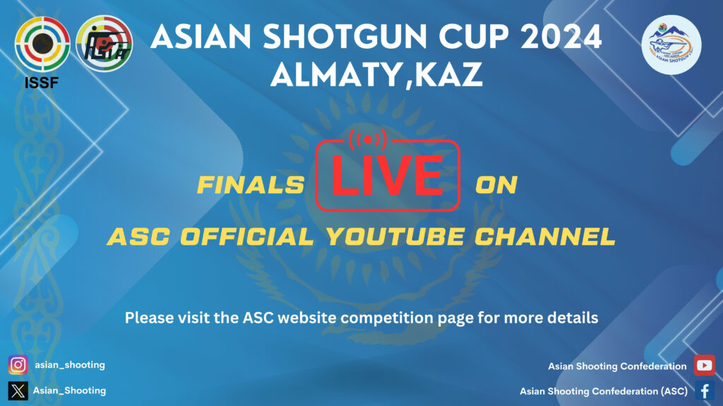 We are pleased to announce that Asian Shooting Confederation in collaboration with Kazakhstan Sports Shooting Federation will broadcast/Live Stream Finals of Asian Shotgun Cup 2024 Almaty on its official YouTube Channel starting 23rd September 2024.