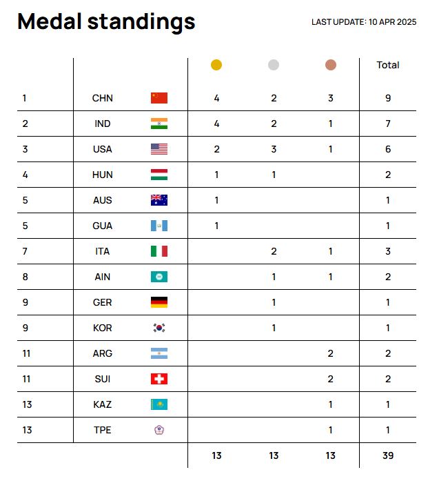 With these results, China leads the medal standings, followed by India.