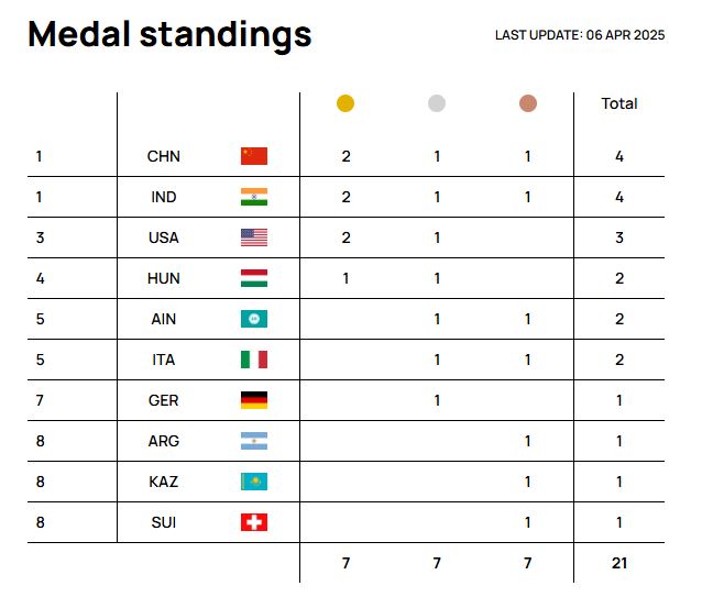 Medal Standings as of 06 April 2025
