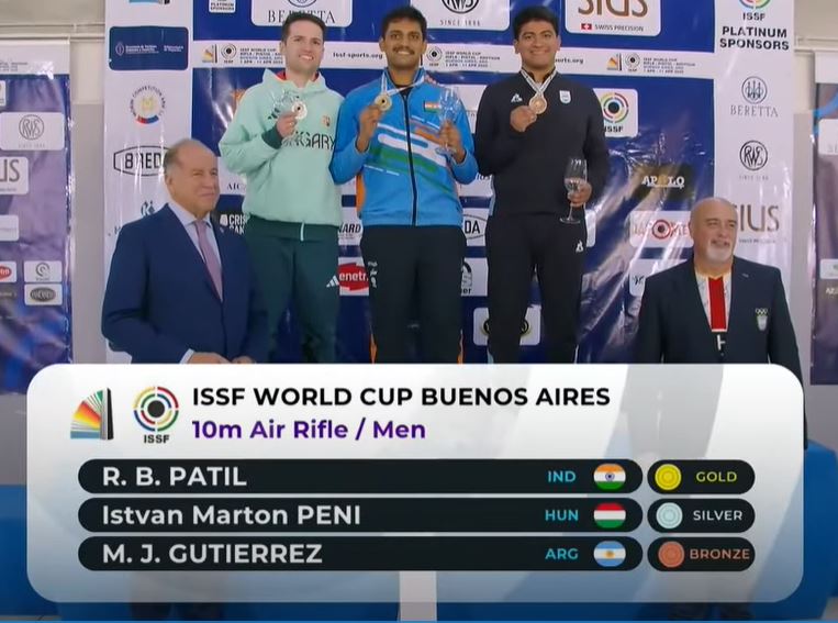 India’s PATIL Rudrankksh Balasaheb delivered a strong performance to win the Gold Medal in the 10m Air Rifle Men final on Day 4 of the ISSF World Cup Rifle/Pistol/Shotgun in Buenos Aires, Argentina.
