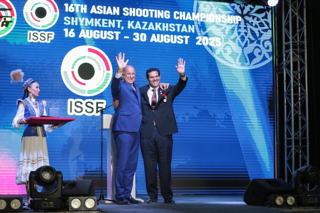 At the grand opening of the 16th Asian Shooting Championship in Shymkent, a historic moment of unity and recognition took place. The ISSF President presented the “Golden Medal of the Honor of the ISSF President” to the ASC President H.E. Sheikh Salman AlSabah, as a mark of deep appreciation and recognition for his efforts in the promotion and development of the shooting sport globally.