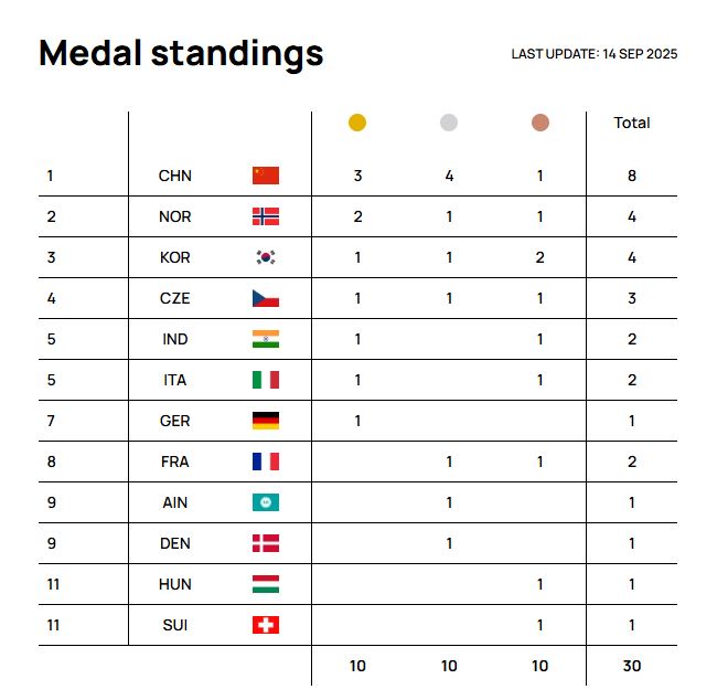 Updated Medal Standings as 14 Sep 2025