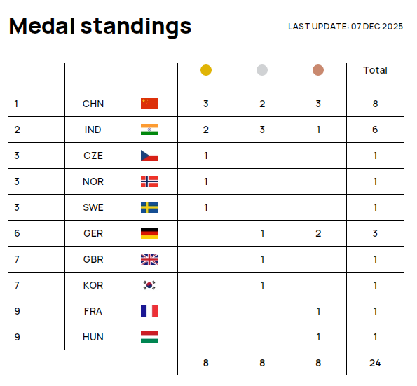 Medal Standings as of 7 December 2025