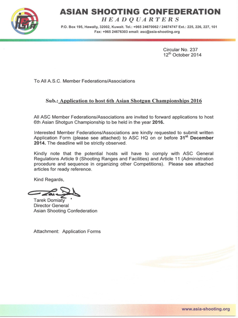 Circular # 237: Applications to host 6th Asian Shotgun Championship - 2016