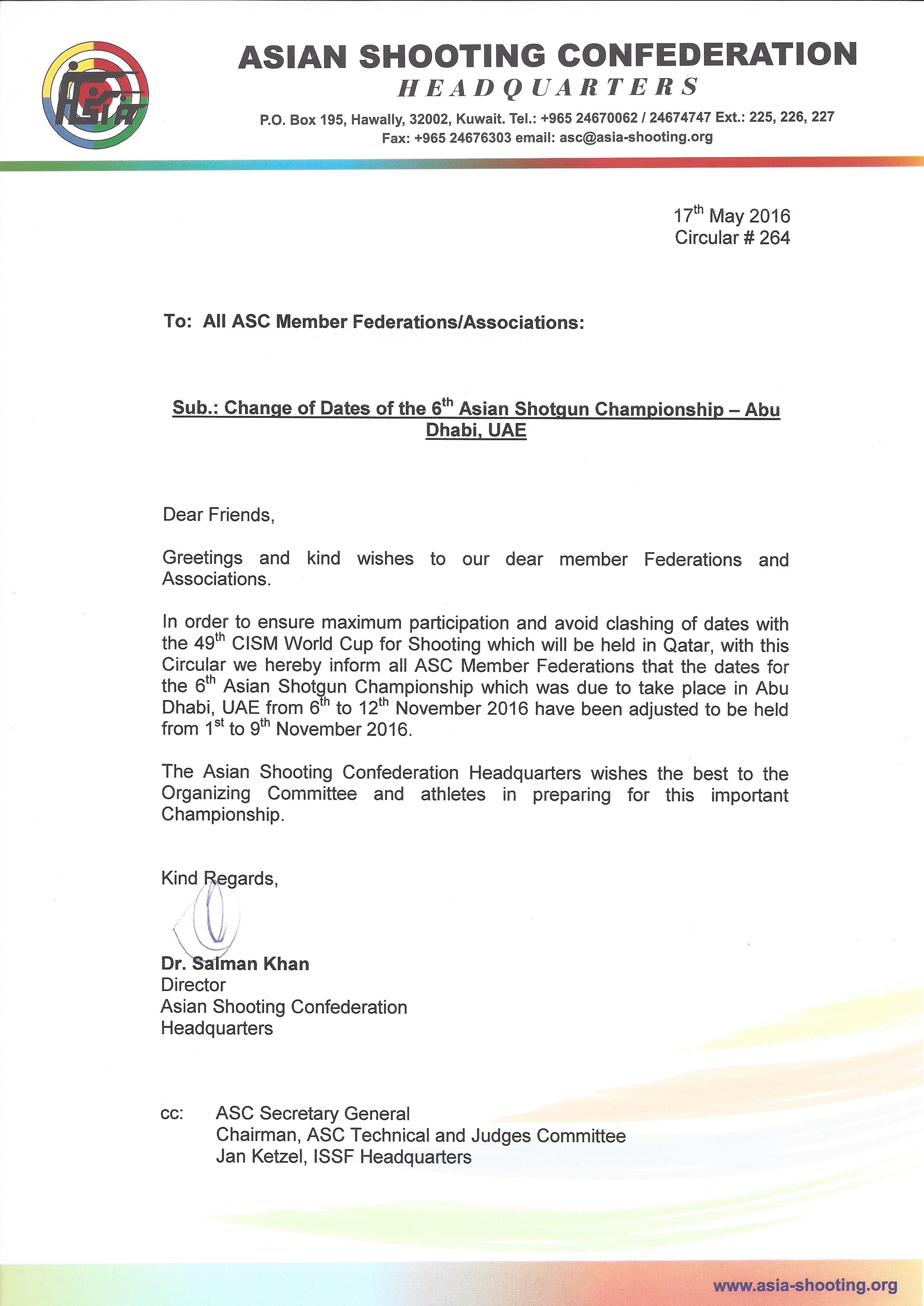 Circular 264 - Change of Dates of the 6th Asian Shotgun Championship 2016