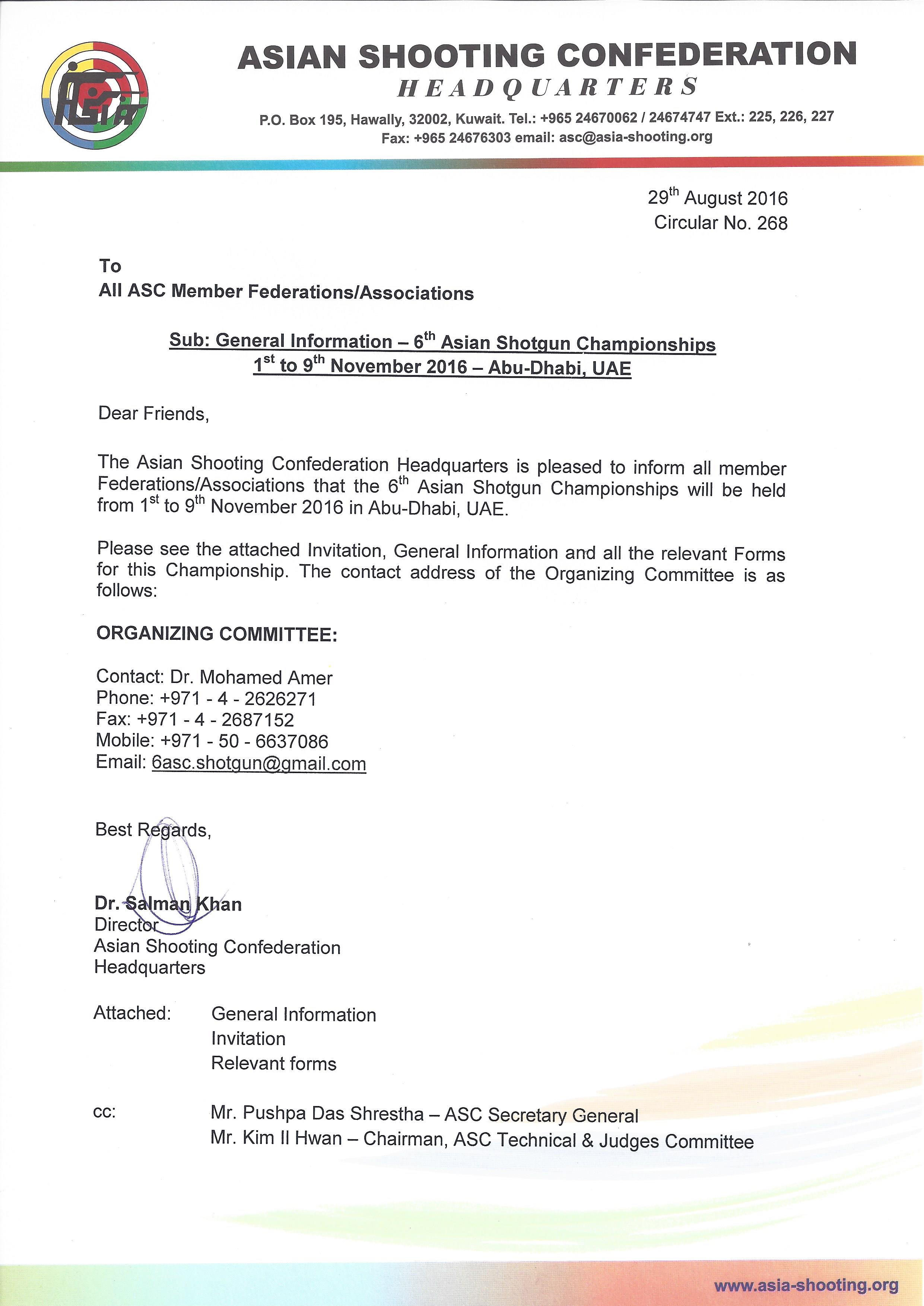 Circular 268 - 6th Asian Shotgun Championships, UAE - General Information