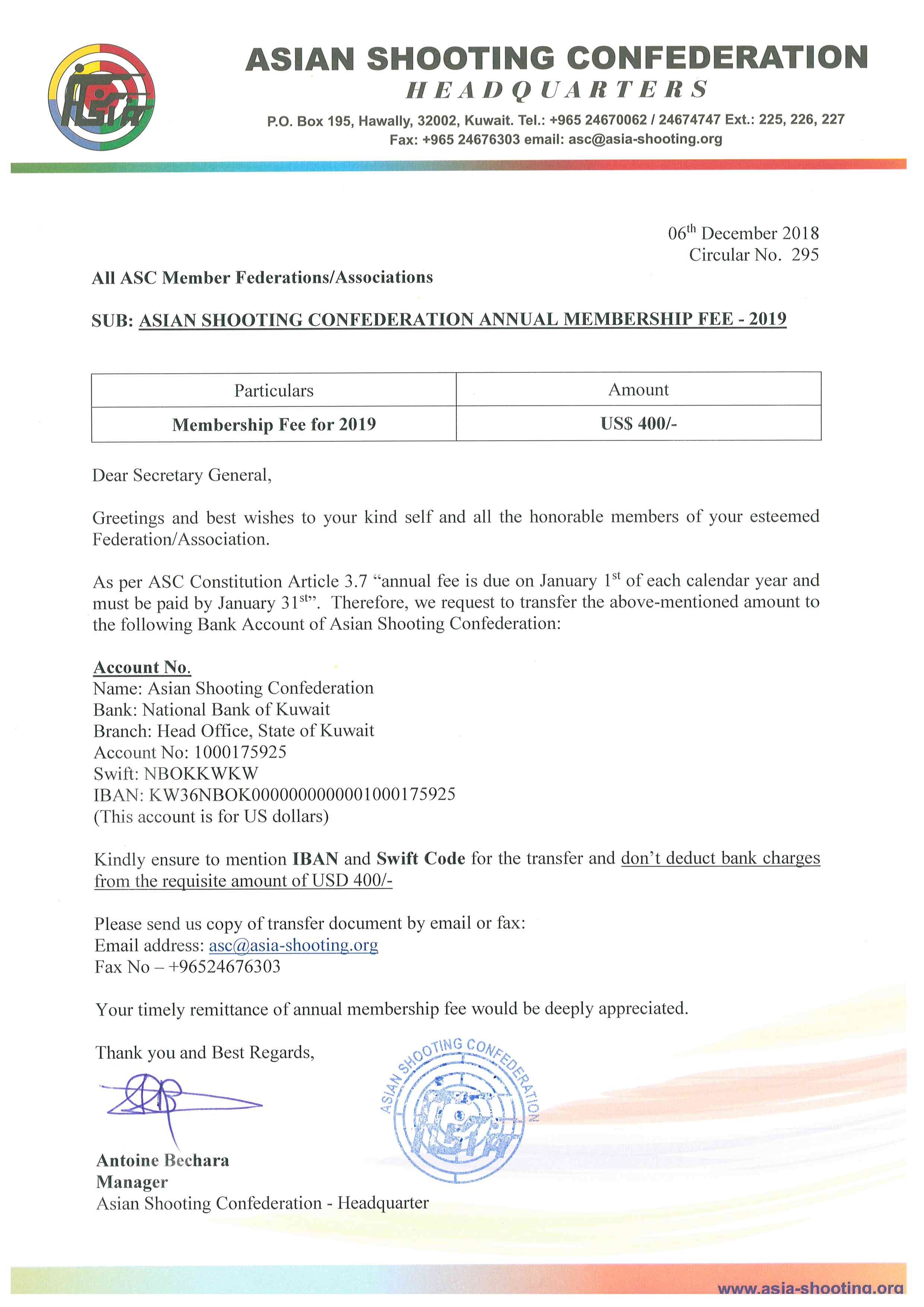 Circular No. 295 - Annual ASC Membership Fee for 2019