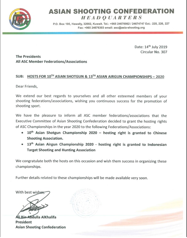 Circular No. 307 - Hosts for ASC Championships 2020